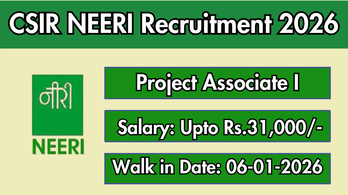 National Environmental Engineering Research Institute (CSIR NEERI) Recruitment 2026 for 01 posts of Project Associate I. Candidates with B.Tech/B.E, M.Sc Can attend the walkin. The Walk-in on 06-01-2026. For detailed information please visit CSIR NEERI official website, csircmc.res.in.